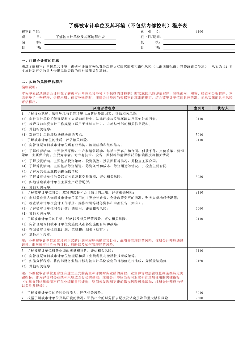 首页底稿模板通用底稿风险评估2100 了解被审计单位及其环境(不包括内部控制)-oo