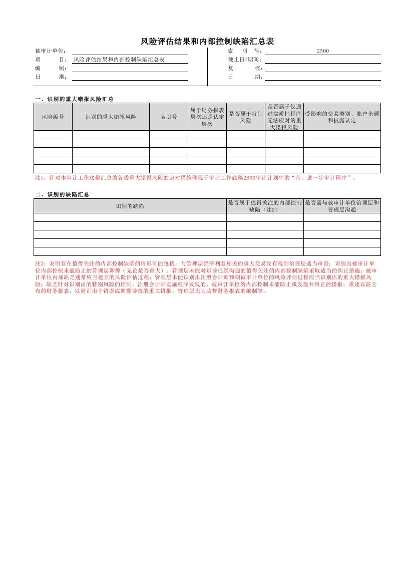 2500 风险评估结果和内部控制缺陷汇总表