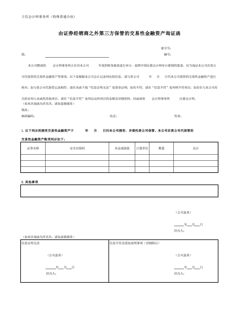 首页底稿模板通用底稿实质性程序4 由证券经销商之外第三方保管的交易性金融资产询证函-oo
