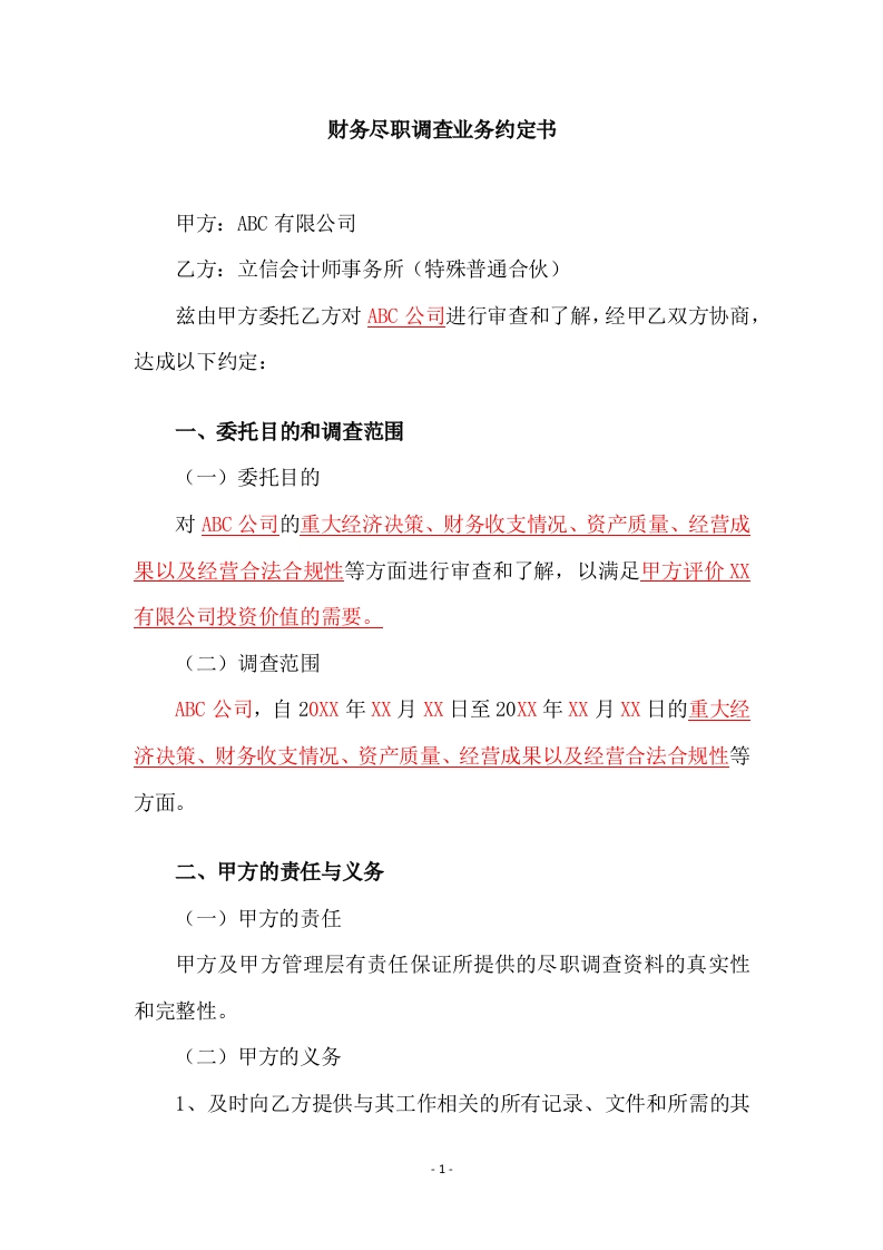 首页底稿模板财务尽调财务尽职调查业务约定书(参考格式)
