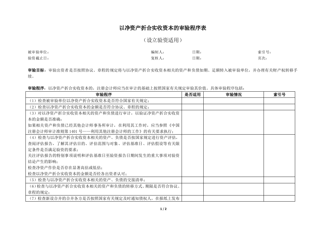 首页底稿模板验资业务4-以净资产折合实收资本的审验程序