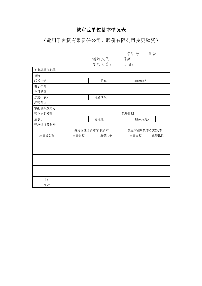 首页底稿模板验资业务被审验单位基本情况表-内资变更适用