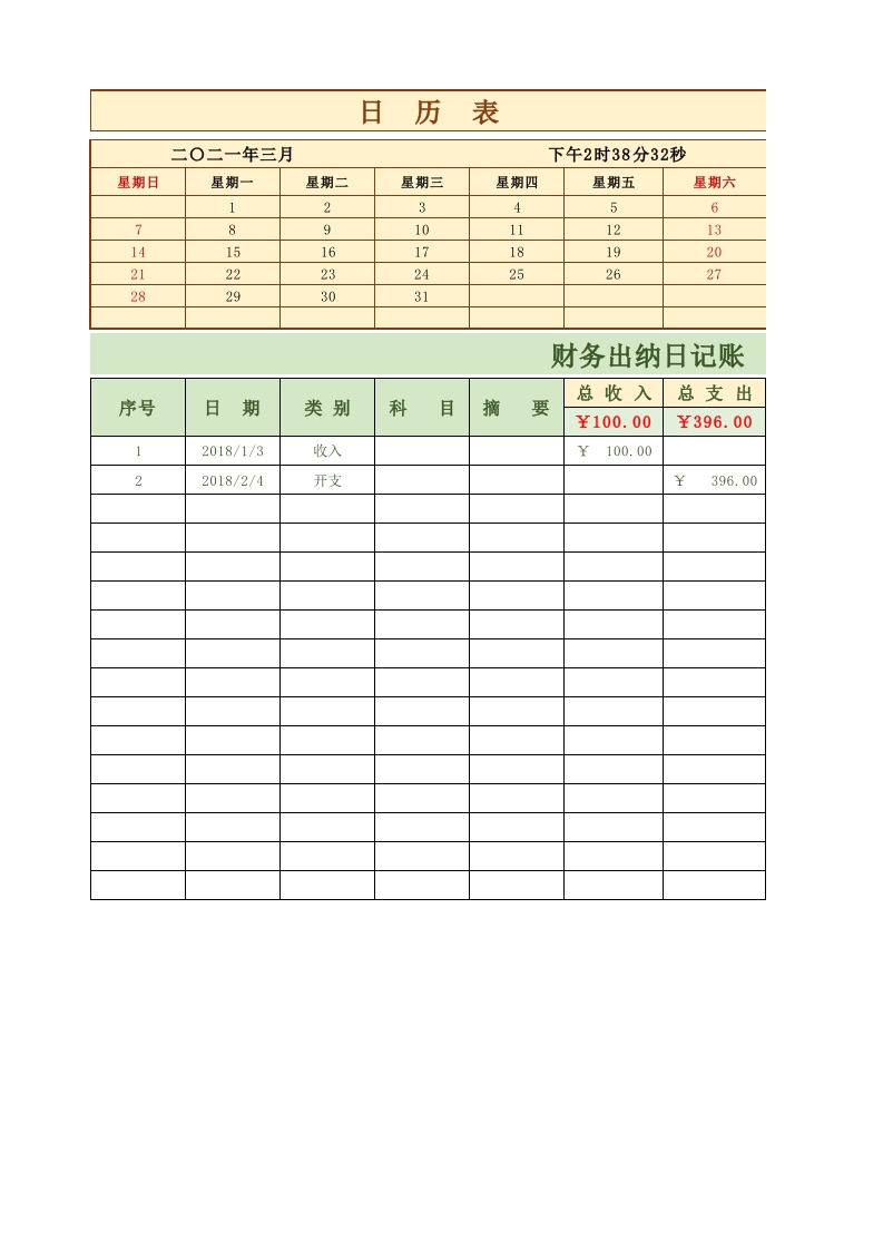 首页会计核算出纳记录84财务出纳收支表-带万年日历表
